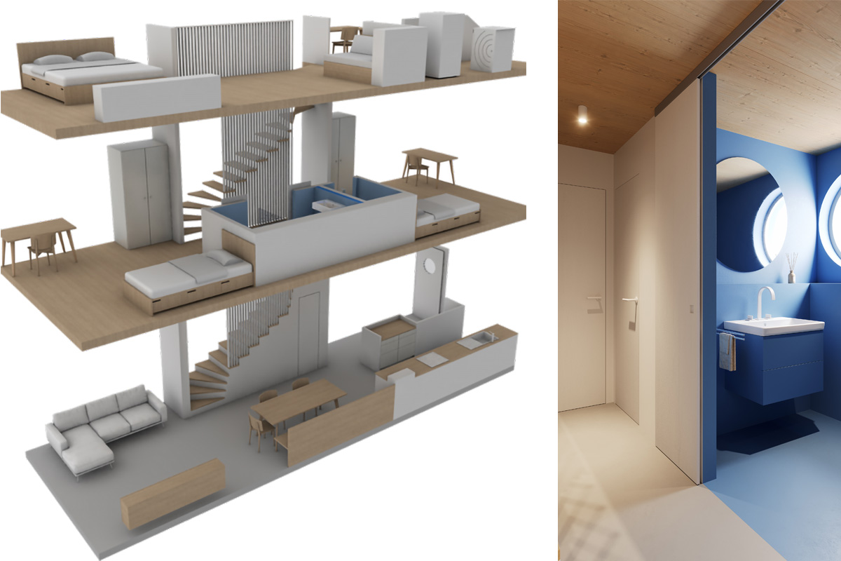 Energetisch erfüllt das Haus den KfW-55-Standard. Jede Einheit erhält eine eigene hocheffiziente Abluftwärmepumpe, eine kontrollierte Wohnraumlüftung mit Wärmerückgewinnung sowie eine PV-Anlage zur Eigenstromerzeugung. Wohngesunde Linoleumböden, weiße Wände, Sichtbetondecken und farbenfrohe Bäder sorgen für besondere Atmosphäre.
