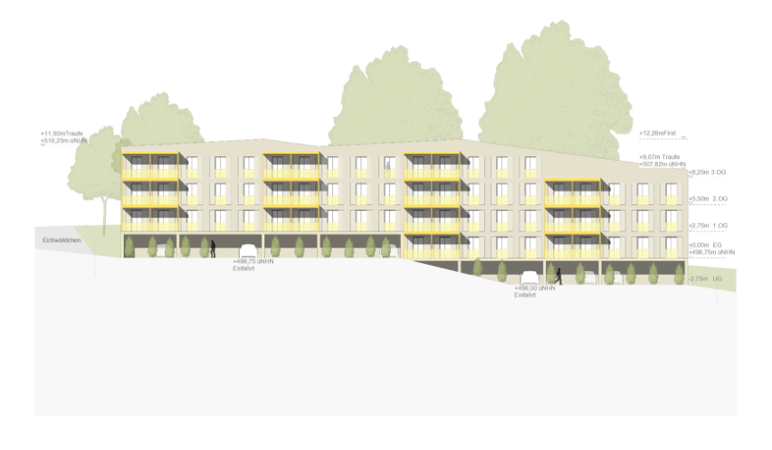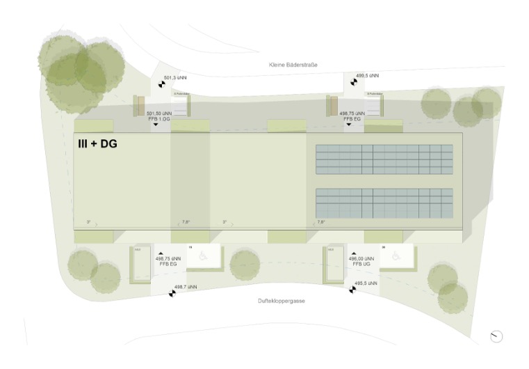 Der Baukörper liegt als kompakter Riegel in der leicht ansteigenden Landschaft. Aufgeständert und in den Hang geschoben, finden unter dem Haus offene, natürlich belüftete, teils barrierefrei zugängliche Stellplätze Platz. Das Haus wird ebenfalls barrierefrei über alle Ebenen erschlossen. Ein zentraler Mittelflur ermöglicht einen flexiblen Wohnungsmix von 2- bis 5-Zimmer-Einheiten für unterschiedliche Lebensmodelle. Große Vorstellbalkone, Abstellräume in den Wohnungen sowie barrierefreie Zugänge erhöhen den Wohnkomfort. Das Dach ist leicht geneigt und nimmt auch die Haustechnik auf. Voll begrünt und mit PV-Anlage versehen, ist es funktional genutzt und gestalterisch prägnant.